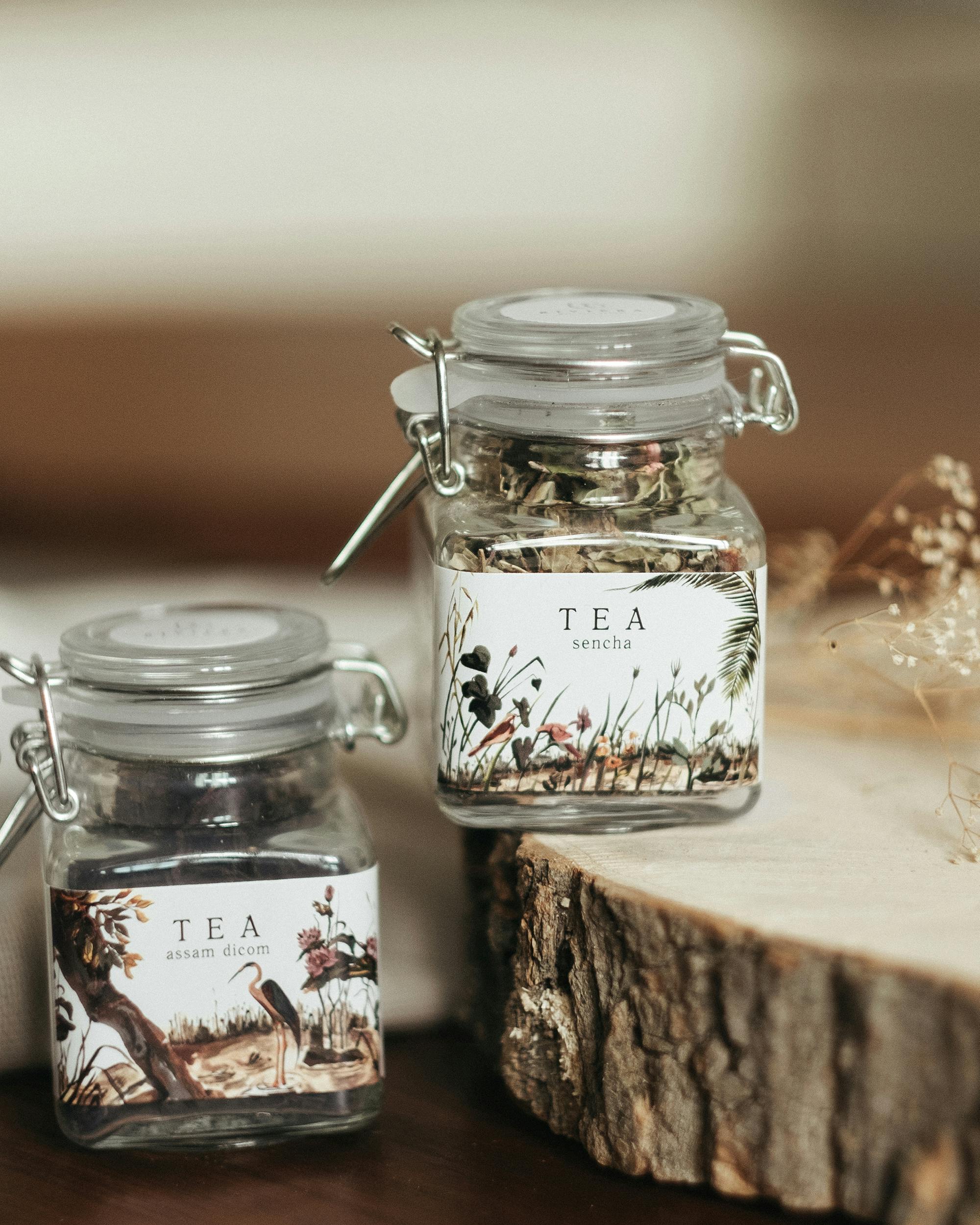 В основе дизайна этикеток для чая лежит специально нарисованная для каждого сорта чайной смеси графика, а также шрифтовая комбинация, сочетающая узнаваемый фирменный стиль отеля Ривьера с теплыми нотами подарка, подписанного рукой.